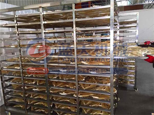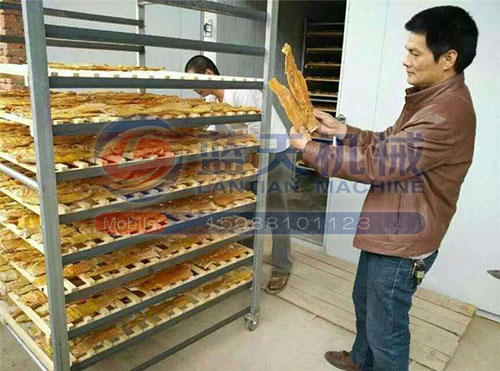 把處理過(guò)的竹筍均勻有序的擺放在不銹鋼托盤(pán)上,把推車(chē)推入烘干房?jī)?nèi),在烘干的過(guò)程中,溫度控制在45-60度,烘干時(shí)間為48個(gè)小時(shí),直至竹筍呈金黃色就表示烘干完成,鮮筍的水份含量較大,通過(guò)壓制在烘干,時(shí)間會(huì)縮短不少。