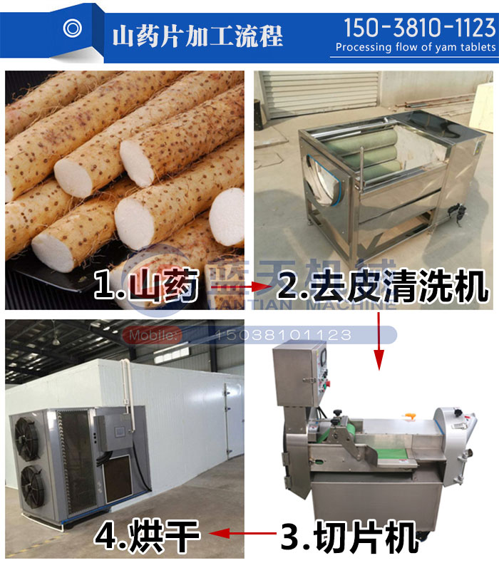 選取條直、粗壯、無腐爛、無霉變斑點的新鮮山藥放入洗滌槽中,用清水洗凈外部的泥土、沙粒等雜質(zhì),然后去皮切片。將切好片的山藥平鋪在烘盤內(nèi),推進(jìn)烘房。將房內(nèi)溫度加熱至50°,加熱30分鐘~1.5小時,濕度升高,注意除濕避免表面硬化,除潮的時候可以保持恒溫狀態(tài)。